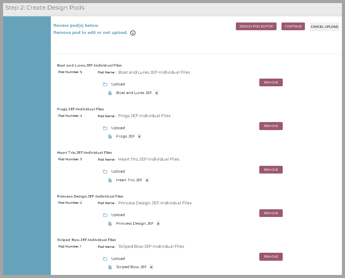 Description: During this step, you will be able to see all the folders and files you uploaded and modify design pods to your preference.